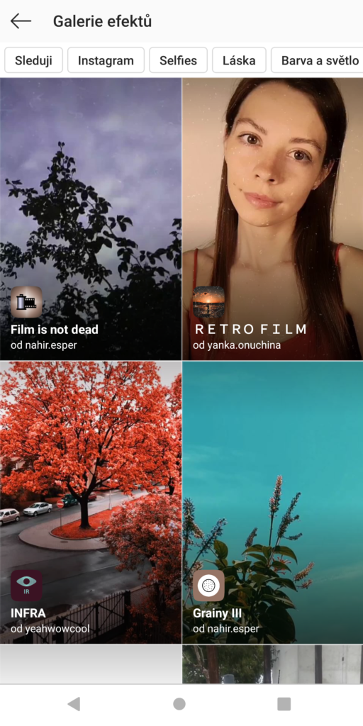 Tvůrci mají nově možnost obohatit IG STORIES o vlastní filtry, které si můžete stáhnout do paměti telefonu a následně je najdete jako jednu z voleb při záznamenávání skrze stories. Nabídku těchto efektů najdete po otevření IG STORIES jako poslední zalistovanou možnost mezi již Instagramem nabízenými filtry pod názvem “PROCHÁZET EFEKTY”. Stejně tak, pokud se vám bude líbit nějaký neobvyklý filtr u někoho na stories, měl by v levém rohu IG nabídnout (pokud se jedná o efekt v jejich knihovně) název. Pak stačí kliknout a dostanete se do knihovny přímo na tento filtr a můžete si ho taktéž stáhnout.