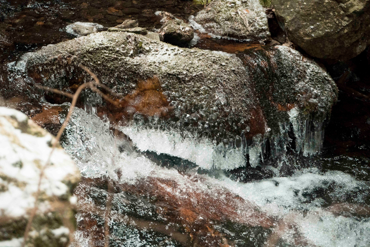 A tam začíná trasa, která mi vyrazila dech. Jeseníky jsem nikdy před tím neměla možnost navštívit. Bylo to moje první setkání s překrásnou přírodou této rezervace. Zima, padající sníh a led tomu jisto jistě dodal nezapomenutelnou atmosféru, která mi utkvěla nejen v paměti. Fotila jsem o sto šest. Jinak to ani nešlo. Mráz prostě umí malovat na jedničku. Umí taky mimo jiné vytvořit ledovou krustu na místech, kde už se mi jeho umění méně hodilo. Výše položené cesty byly zamrzlé, a tak jsem si užila lezené po čtyřech.