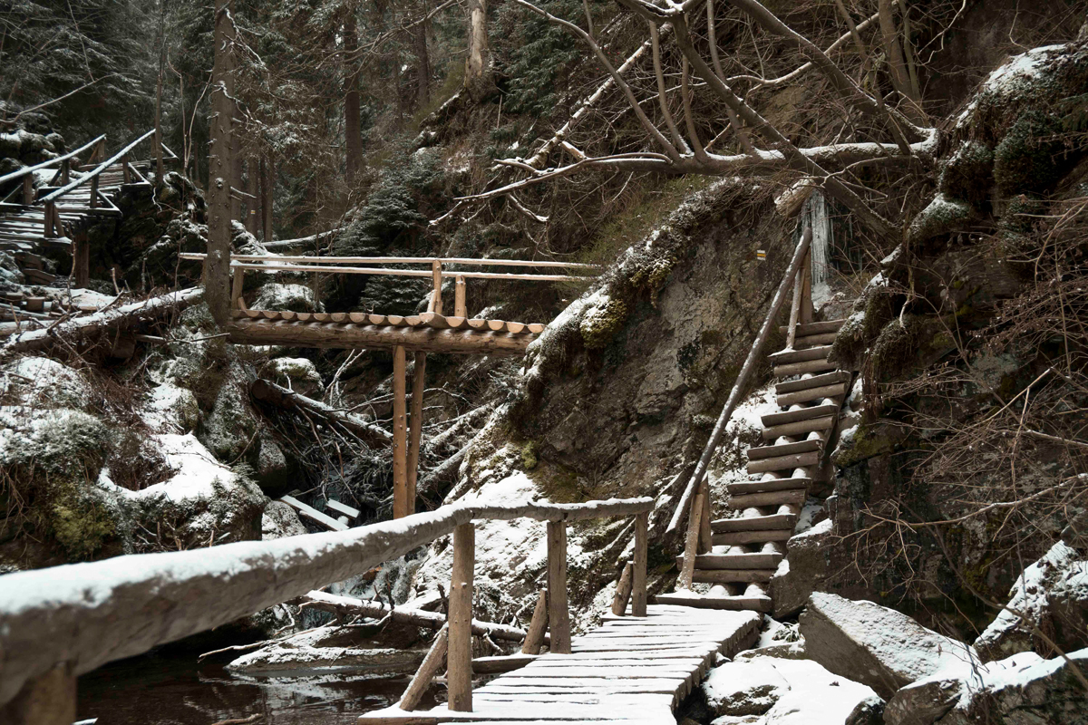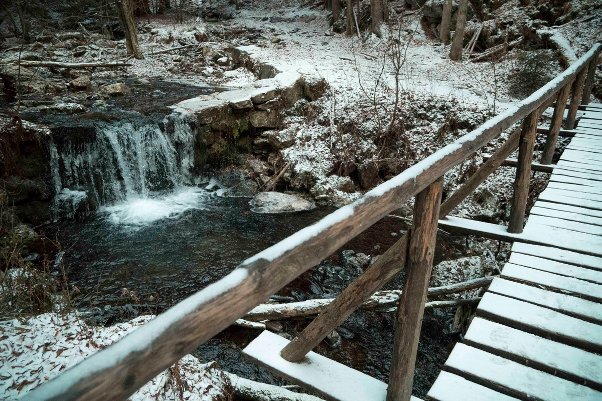 Možná ale i to byl důvod, proč nikde nikdo nebyl. Potkala jsem za celý den jen jednoho zapáleného fotografa a jeden pár. Jinak jsem měla celé údolí, vodopády a dřevěné mosty pro sebe. Sníh utišil veškerý hluk. V jednu chvíli jsem si říkala, že se snad poprvé hecnu, svléknu do naha a vykoupu ve studené vodě. Celý výlet jsem totiž četla knihu Scotta Carneyho, Co tě nezabije, kterou mám stále rozečtenou. Věnuje se tématu otužování, správného dýchaní, meditaci a dalším technikám pro zlepšení fyzické síly a mentální odolnosti. Hlavním průvodcem těchto technik je Wim Hof. Já zatím zvládám každé ráno pouze studenou sprchu. Jeho chůzi po horách jen v tričku v mrazu si vyzkouším možná někdy v budoucnu, pokud se k nečemu takovému vůbec rozhoupu.