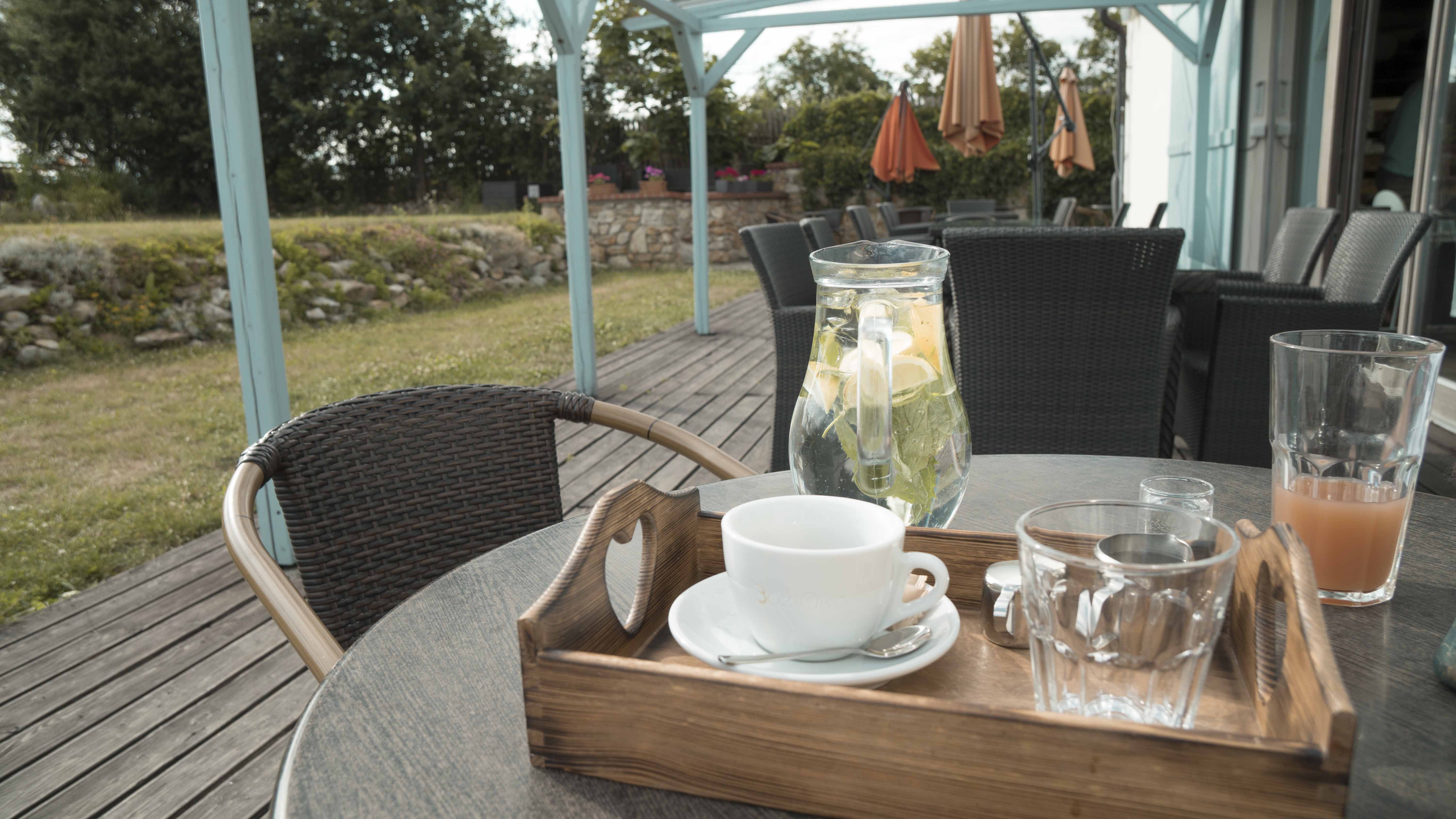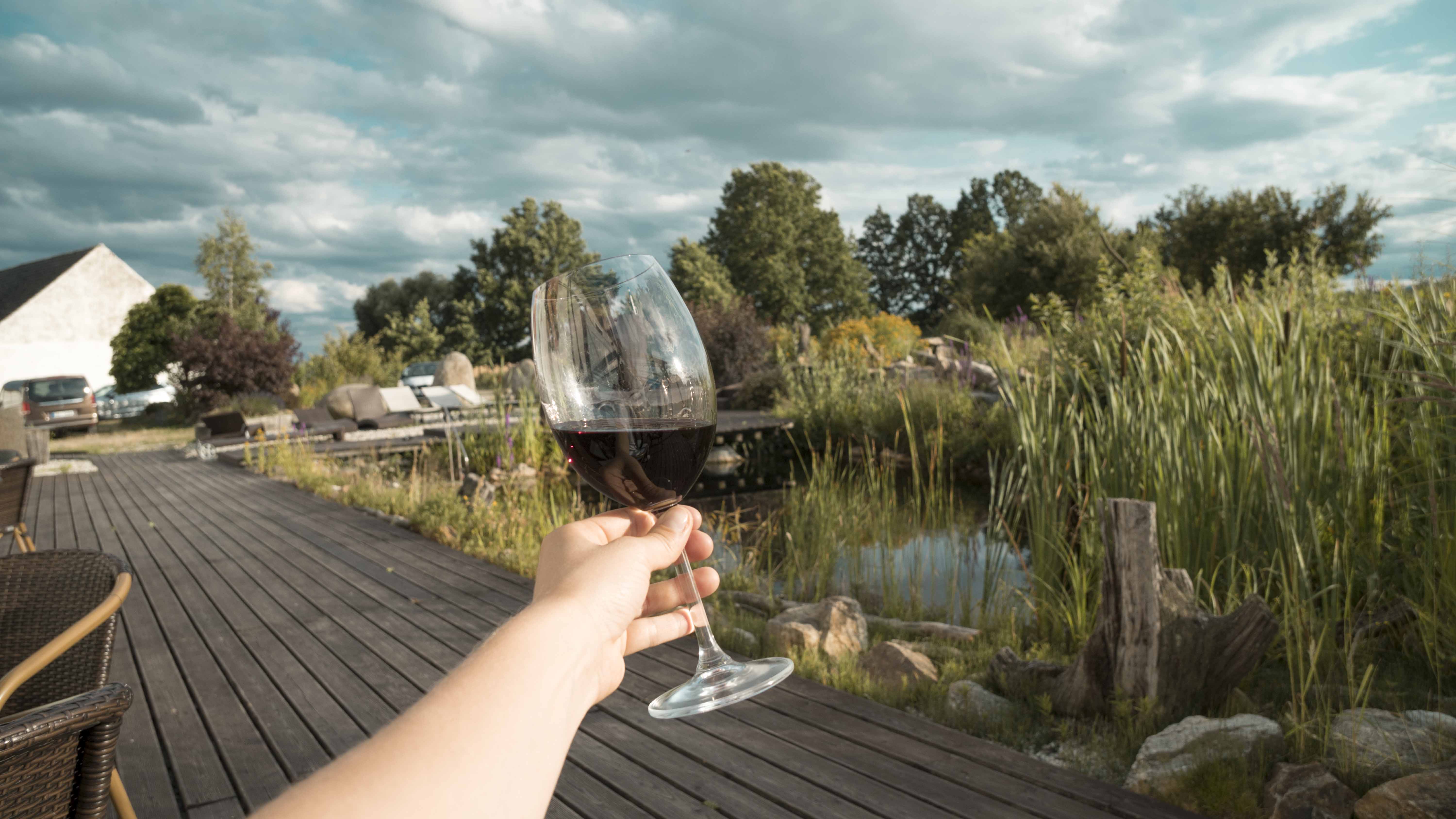 Co mě uchvátilo asi nejvíc bylo sezení vzadu za hotelem, kde bylo i venkovní jezírko, které se zřejmě využívá po sauně, velká zahrada s různými zakoutími a možnost užít si západ slunce. Součástí je i restaurace, která funguje do večera. My si dali sklenku dobrého českého vína a zkombinovali to se sladkými plněnými knedlíky. ? Ideální mix na dobrou noc, že?