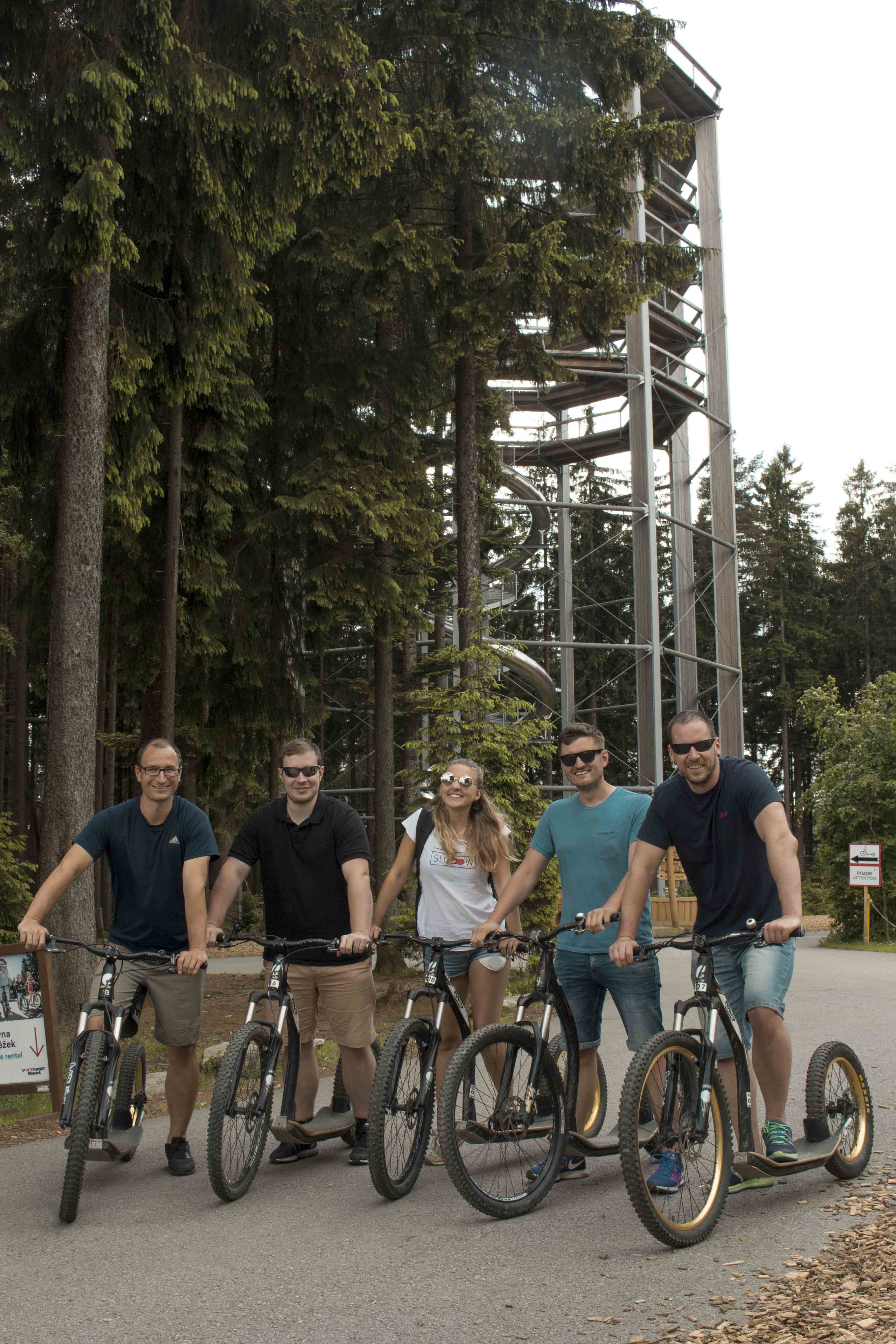 Hned pod stezkou korunami stromů najdete půjčovnu koloběžek. Vypůjčili jsme si koloběžky na cestu dolů k bobové dráze a vyzkoušeli si novou 3,5 km dlouhou trasu. Půjčení za 1 jízdu stojí kolem 170 Kč. Koloběžky vracíte dole u lanovky na vyznačené místo a dál se o ně už nestaráte, kluci si je sami vyvezou nahoru.