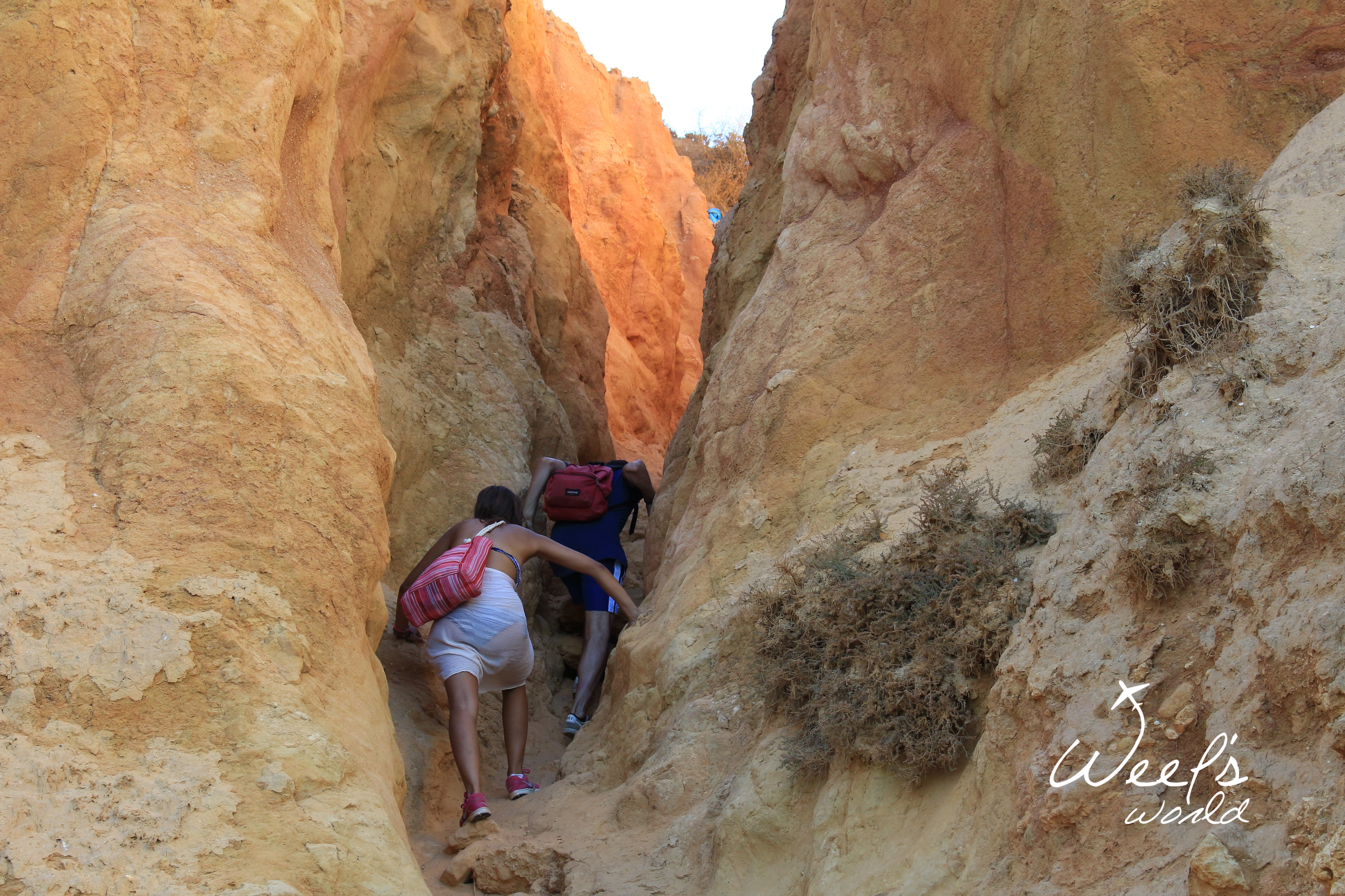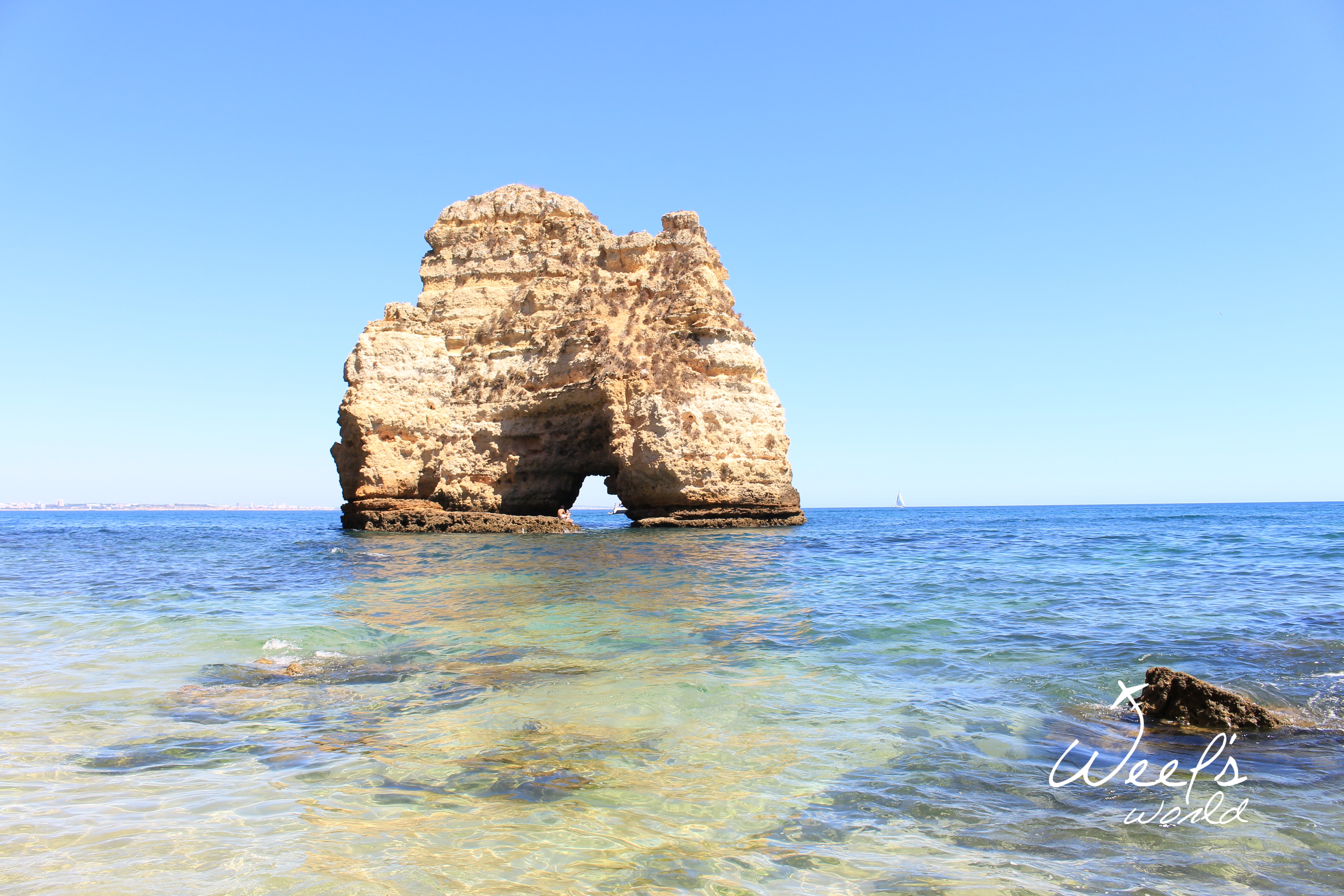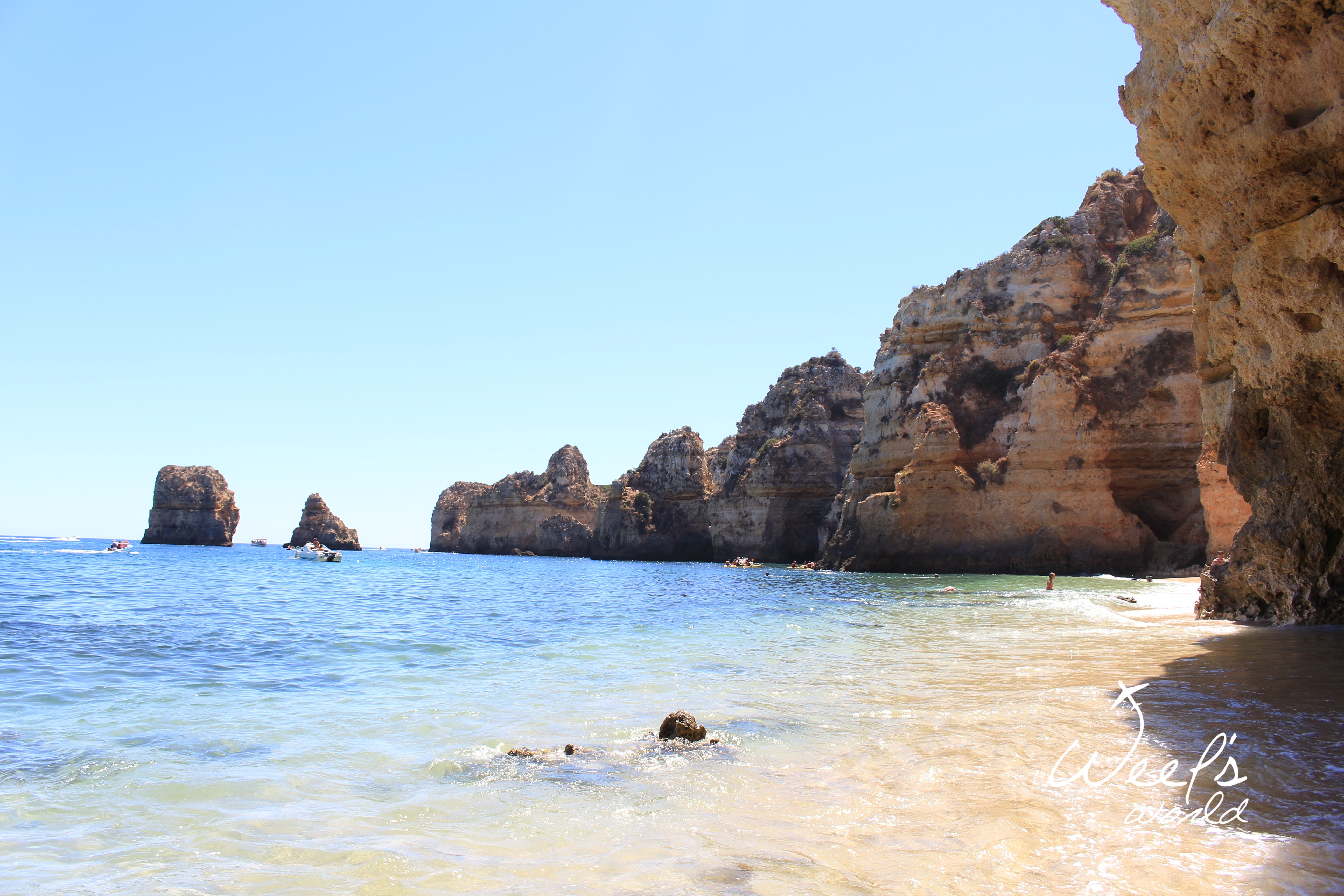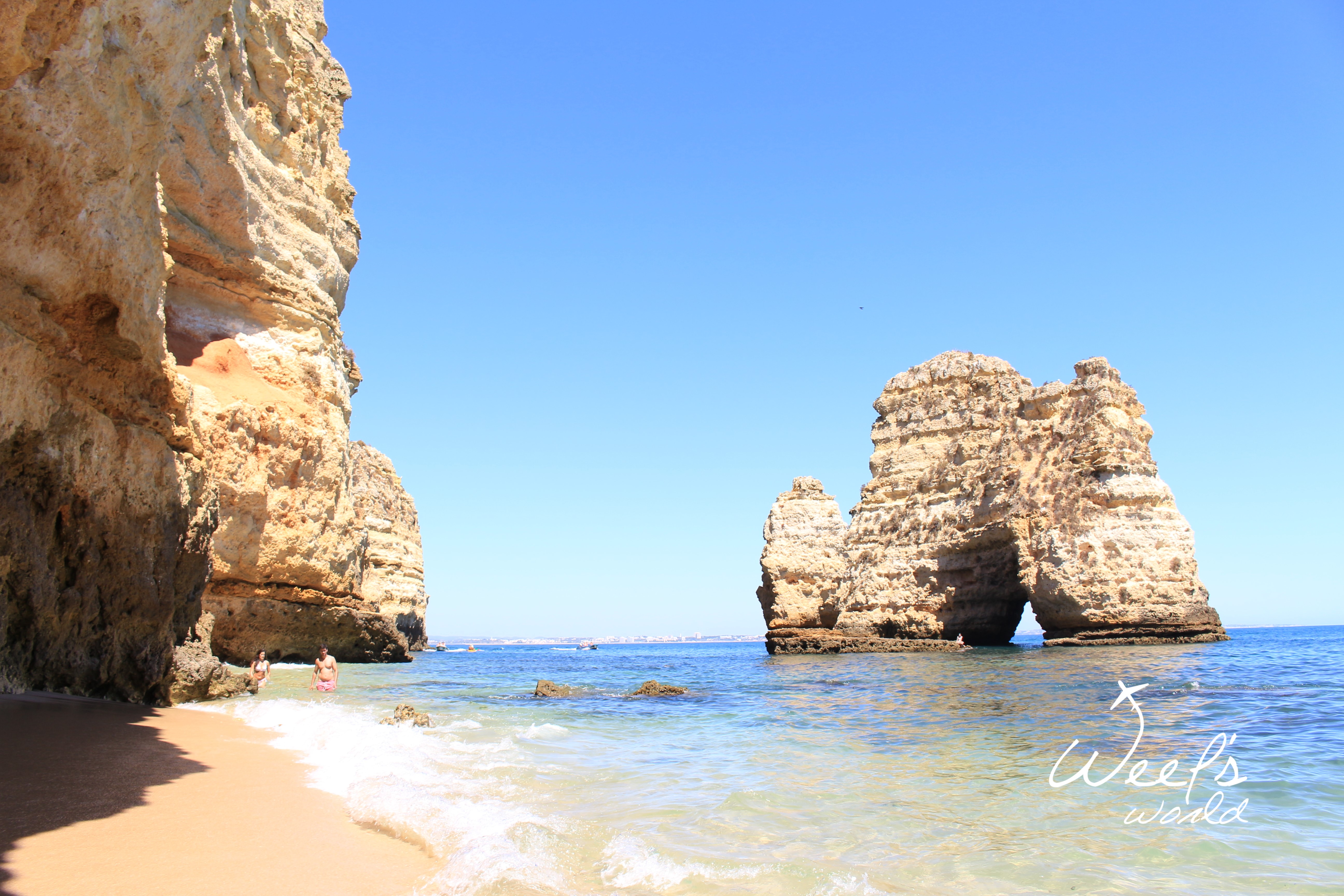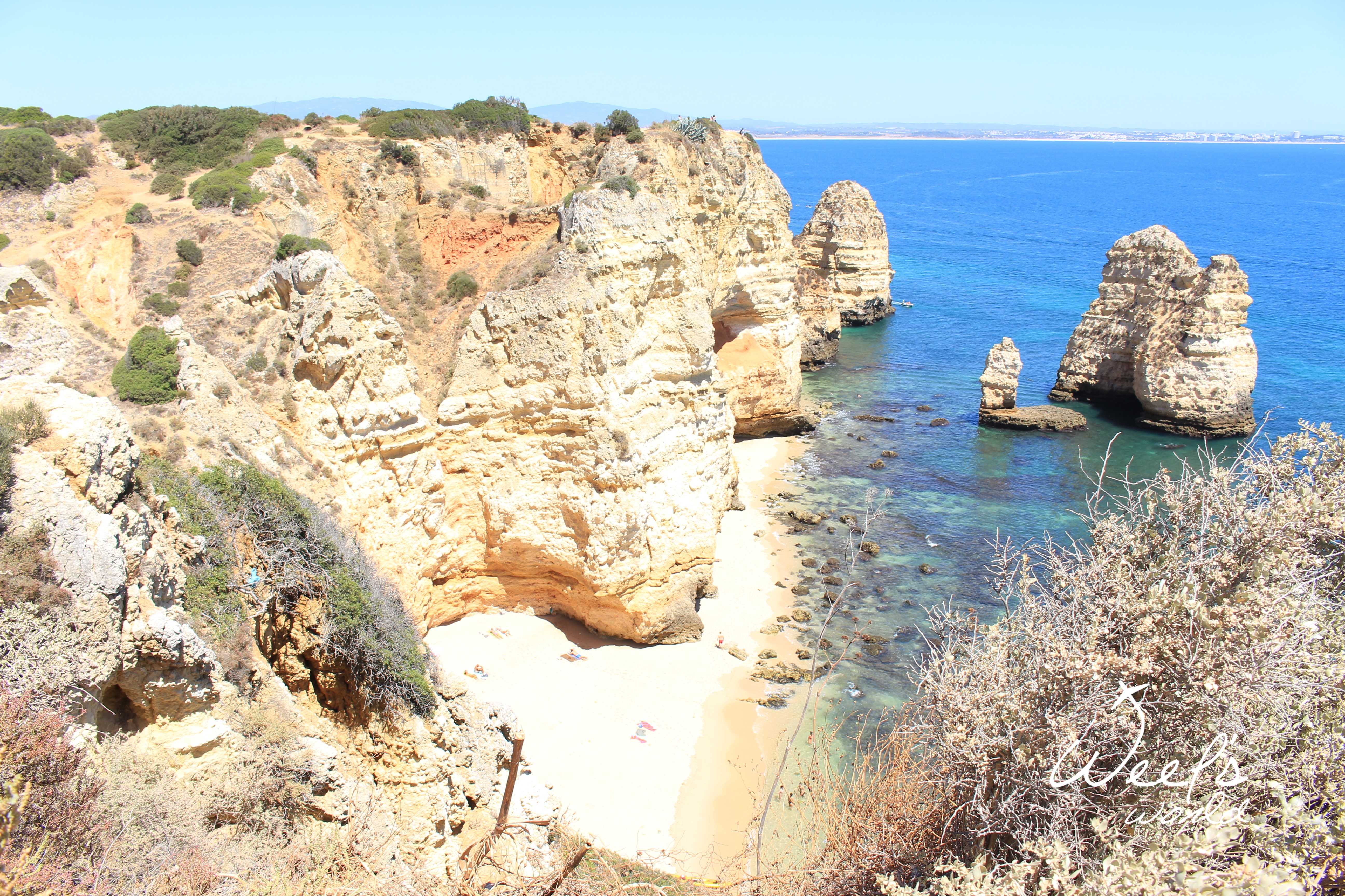 Poslední zastávkou je Lagos. Tam najdete nespočet pláží. My si vybrali tu méně přístupnou, kam zavítají buď kajakáři a nebo ti, kteří se nebojí tak trochu sešplhat skálu. ? V žabkách to samozřejmě nešlo, takže doporučuji pevnou obuv a nebo vyzout. Tuto pláž najdete poblíž view pointu Farol da Ponta da Piedade. Stačí nechat auto na parkovišti poblíž a vyjít na útesy, odkud uvidíte několik zapadlých pláží. Z té, kterou jsme objevili my, pak můžete doplavat na pláže další, které jsou nudistické.
